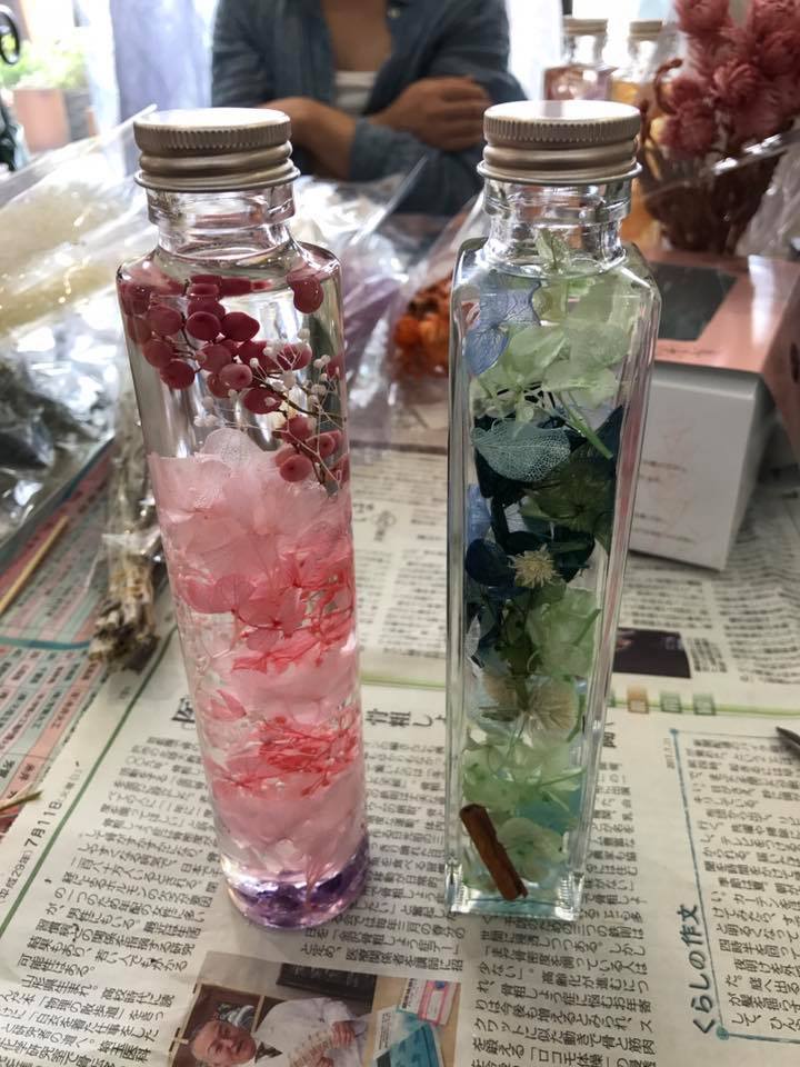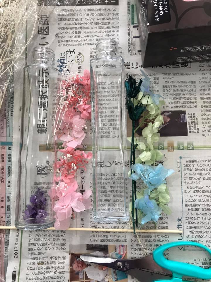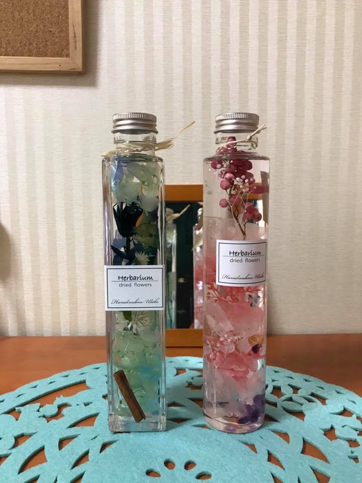 ハーバリウムというのは「植物標本」という意味らしく、ドライフラワーやプリザーブドフラワーを瓶に詰め、特殊な液体に漬け込む方法で今回は作りました。