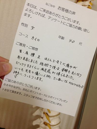 カイロプラクティックコース、女性、40代のお客様です。ありがとうございます!