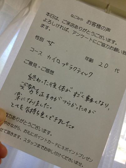 カイロプラクティックコース、女性、20代のお客様です。ありがとうございます!