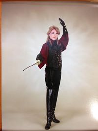 で、フェルゼンの衣装イメージは、キュロットにハイソックス、ヒールの靴、のイメージだったのですが、こちらでは、長ズボンにスターブーツ(男役スターが履く、丈の長いブーツ。こちらで体験できるキャラはスター級のキャラばかりなので、ブーツもスターブーツばかりです)でした。