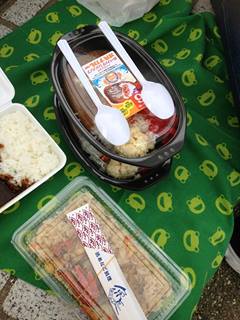 お得なチケットが3枚綴りなので、合計3食ずつ抱えて、隣接の弁天山公園で頂いて来ました。