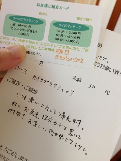 「いつも楽~になって帰れます。机にお友達紹介カードをおいてみては?お互いに何かサービスを少し。」