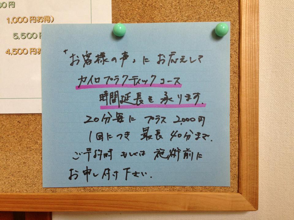 そして、ご要望のカイロ延長!ご用意しました!20分2000円で承ります!回数券の方は20分ごとに半券ずつ頂戴します。どうぞ、ご利用くださいませ(⌒▽⌒)