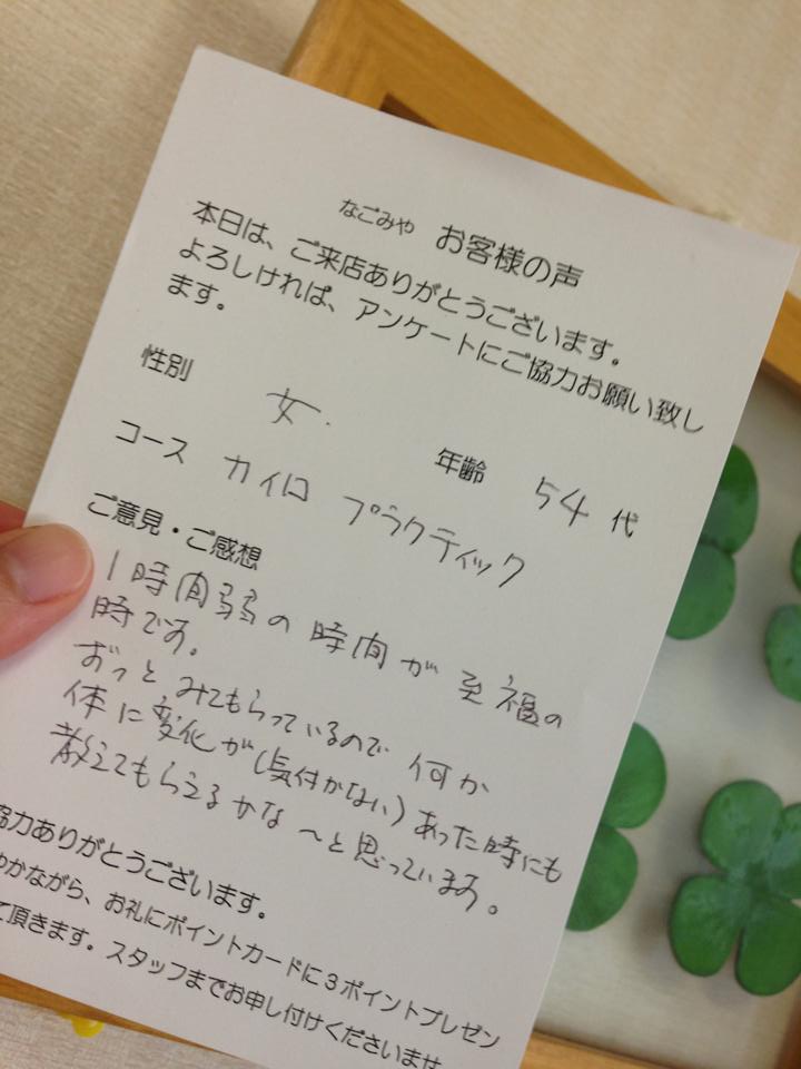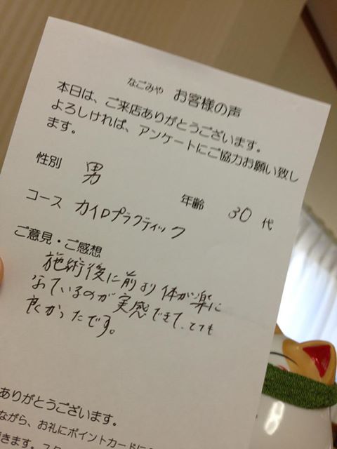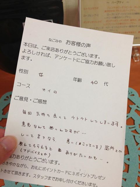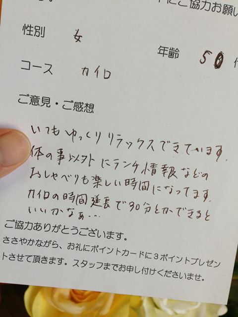 「毎回気持ち良くてウトウトしてしまいます。意見なんて無いんですが…しいて言うなら、悪い(こっている)箇所とか教えてもらえるとありがたいかも(アドバイスとか)…」