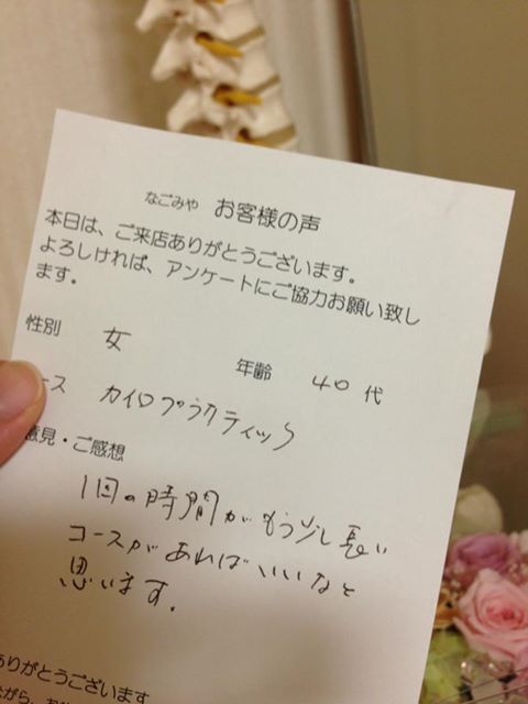 カイロプラクティックコース、女性、40代のお客様です。ありがとうございます!「1回の時間がもう少し長いコースがあればいいなと思います」