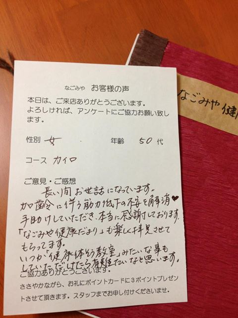 「長い間お世話になっています。加齢に伴う筋力低下の不安を解消♡手助けしていただき、本当に感謝しております。「なごみや健康だより」も楽しく拝見させてもらっています。いつか「健康体そう教室」みたいな事もしていただけたら有難いなと思います。」