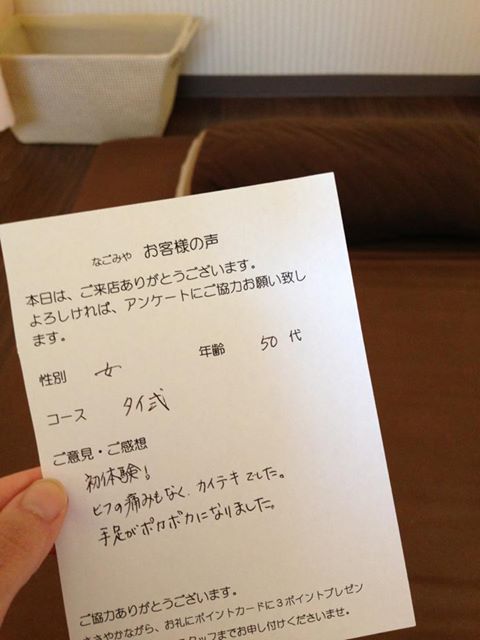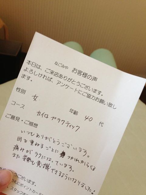 嬉しいお言葉、ありがとうございます。こちらのお客様は、1回目 のご来店から、2回目のご来店まで半年以上空いてみえました。で も、2回目ご来店時に、「初めて受けた後、物凄く体がラクで、や っぱり定期的に受けたいです」と言ってくださった方です。こちら こそ、ずっと、お役に立てるよう頑張ります!(^^)!